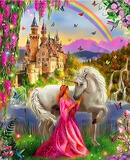 «Принцесса с единорогом на фоне радуги у замка»