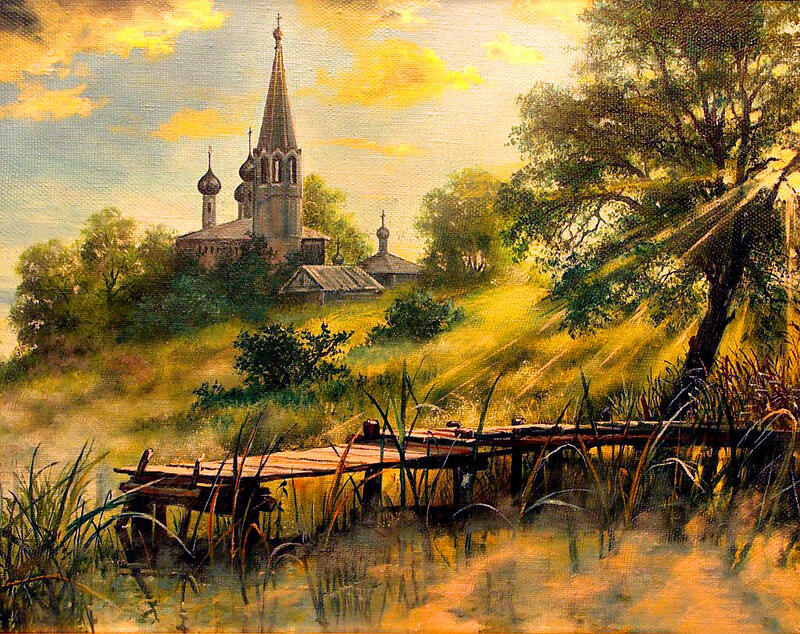 «Солнечный день на причале с видом на церквушку»